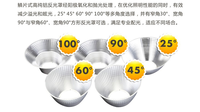 • 鳞片式高纯铝反光罩,照明性能优越,25°-100°多角度选择,满足专业配光,适应不同场合;